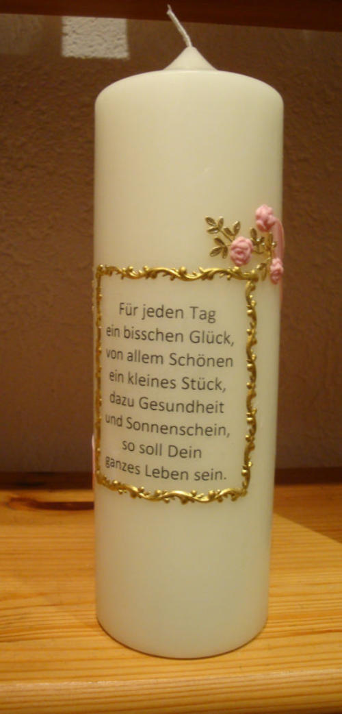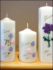 Sie suchen eine besondere Geburtstagskerze?Wir haben ständig eine große Auswahl an fertigen Kerzen vorrätig. Natürlich gestalten wir Kerzen auch nach Ihren individuellen Wünschen. So bekommen Sie eine persönliche Geburtstags-kerze, z.B. mit Foto und Beschriftung.