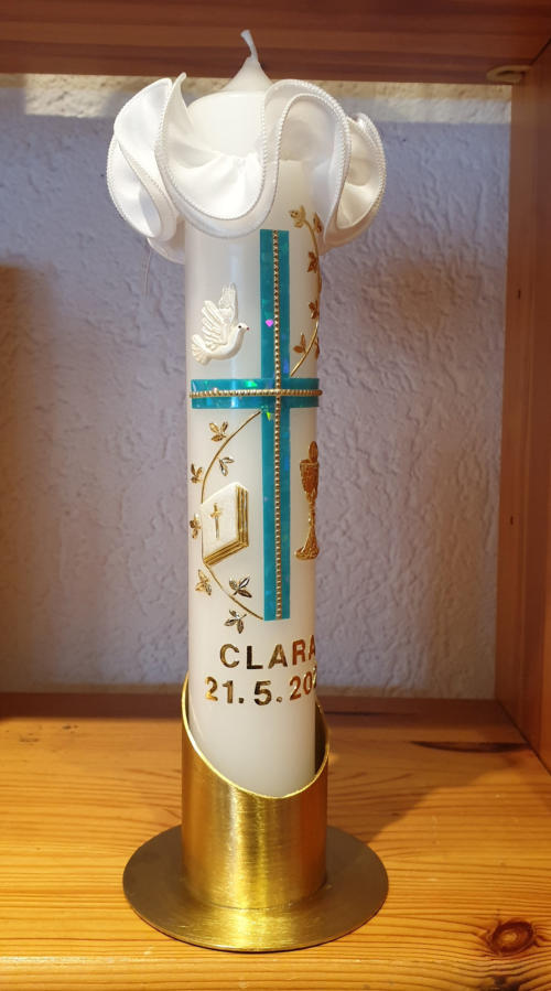 Kerzen selbst verzierenBasteln liegt wieder im Trend!Selbstverzierte Kerzen sind ein ganz besonderes und persönliches Geschenk.Dafür gibt es viele Anlässe, wie z.B.Taufen, Kommunion, Hochzeiten, Jahrestage, Geburtstage und vieles mehr.Gerne unterstützen wir Sie dabei.Dafür haben wir Bastelsets zusammengestellt, mit denen auch ohne große Vorkenntnisse das Verzieren Spaß macht und gelingt! Die Bastelsets beinhalten das komplette Verziermaterial, natürlich mit dem persönlichen Namen, sowie eine Anleitung zur Verarbeitung und ein Bild der fertigen Kerze.Natürlich können Sie sich auch eine Kerze aus unserem umfangreichen Gesamtprogramm aussuchen. Auch dafür stellen wir Ihnen gerne das Verziermaterial zusammen.
